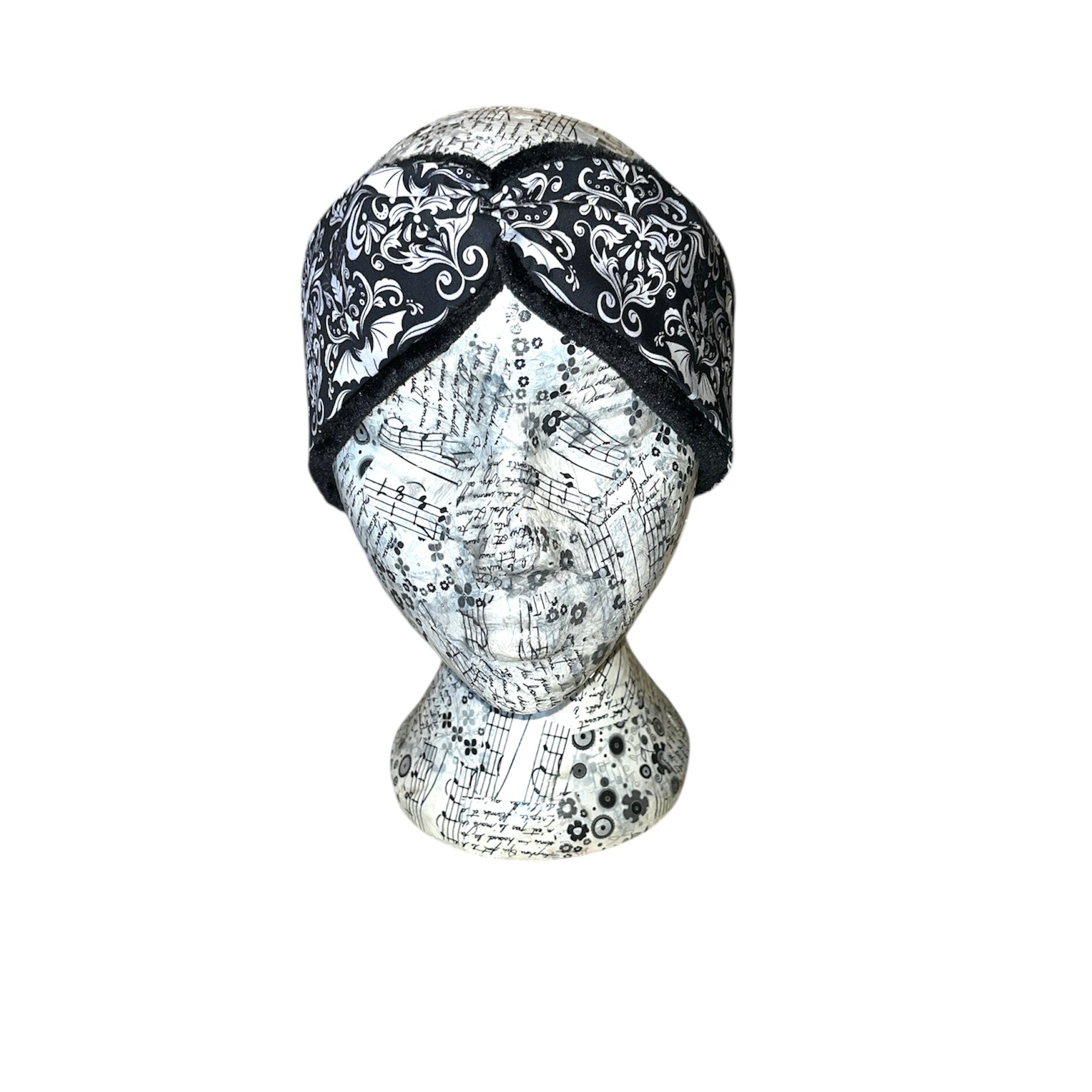 Black cuddle Fleece lined black and white damask bat headwarmer/ear warmer