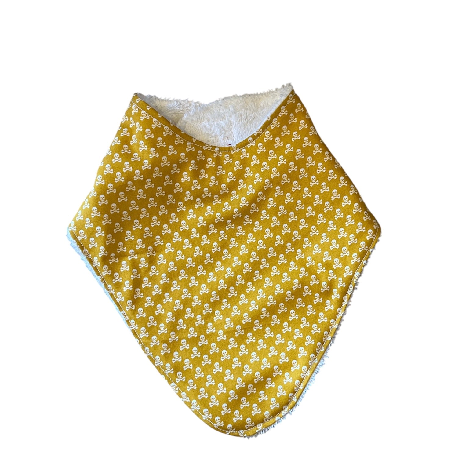 White towelling backed ditsy skull dribble bib for babies and toddlers.
